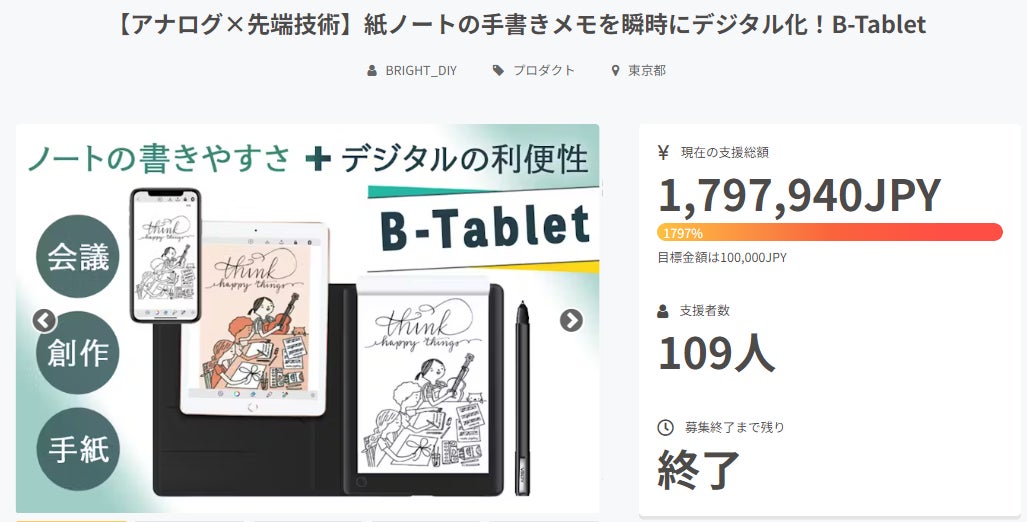 皆様にご満足いただけるリターンをお届けできるよう、全力で取り組んで参りますので引き続き、「【アナログ×先端技術】紙ノートの手書きメモを瞬時にデジタル化!B-Tablet」をよろしくお願い致します。