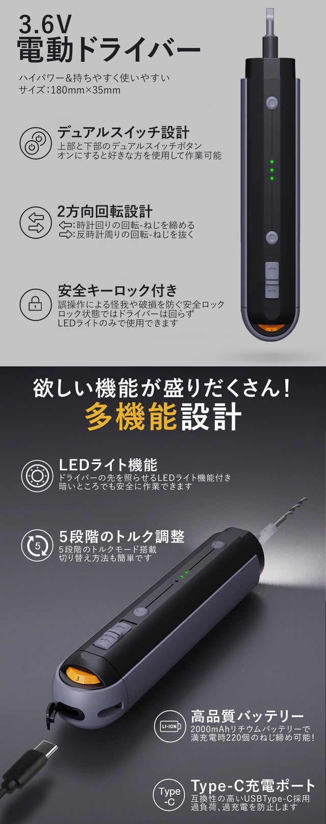 5段階のトルク調節機能、高品質バッテリー、ロック機能、LEDライトが搭載された電動ドライバーに狭いところでも作業が可能になる延長コード、使いやすいバールや耐久性の高い多種多様なビットまでセットになった痒い所に手が届く多機能ツールです。