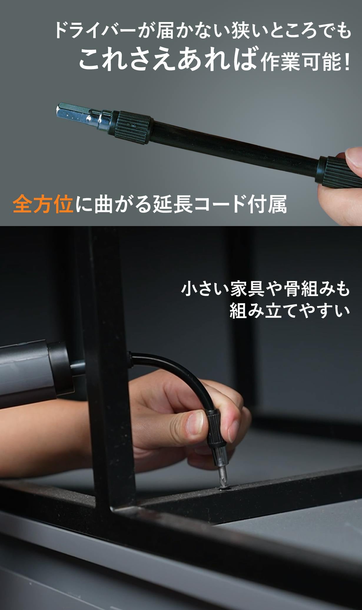 5段階のトルク調節機能、高品質バッテリー、ロック機能、LEDライトが搭載された電動ドライバーに狭いところでも作業が可能になる延長コード、使いやすいバールや耐久性の高い多種多様なビットまでセットになった痒い所に手が届く多機能ツールです。