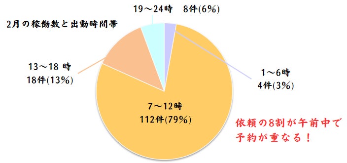 お気づきの通り、病院に受診される方や退院される方が介護タクシーを利用されるため、出動時間帯の約8割が午前中で、逆を言えば他の時間帯は待機となってしまっているのが現状で、予約が重なり、配車が取れない事も多くのが課題です。