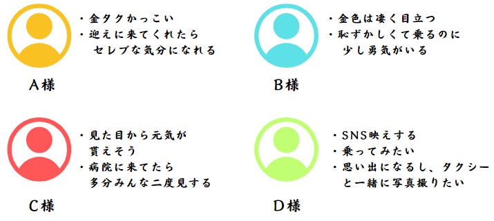 このプロジェクトに賛同して頂いた方々には、特別なリターンをご用意させて頂きます。支援金額に応じて、タクシー広告事業の事業主プランや金色の介護タクシーの無料利用券、金タク限定グッズなどの様々な特典をご提供させて頂きます。
