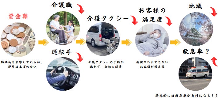 私が考える、今の介護タクシー業界は、資金難による人手不足やタクシーの配車数の減少、予約が重なってしまう事が多く、結果的にお客様の満足度を下げていると考えています。