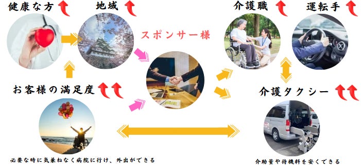 だからこそ、金色の介護タクシー広告プロジェクトを通じて、スポンサーの皆様の契約させて頂くことで職員の処遇改善をはじめ、お客様の満足度のアップに繋がり、必要な時に気兼ねなく、病院やが外出ができることで、健康な方が増えると同時に、地域の活性化に繋がり、スポンサー様のお力になれると確信してります。