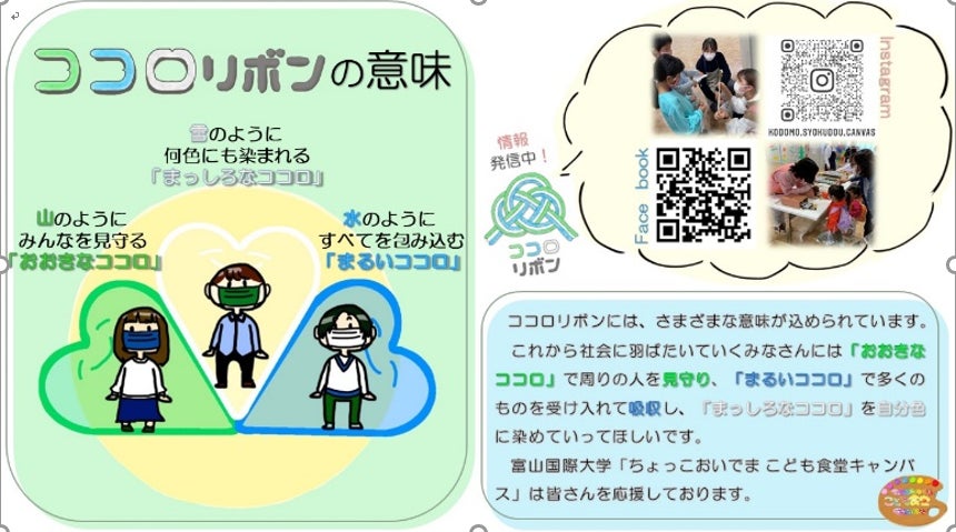 私達のこども食堂では、写真のようなココロリボン活動も行っています。これは、愛媛県から始まったシトラスリボンプロジェクトを自分達の大学オリジナルのものを作ろうと考えて、作成したものになります。