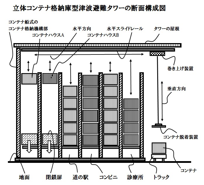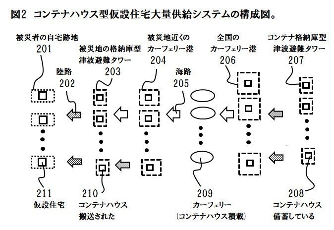 被災した翌日に1万人の被災者に冷暖房、トイレ、浴室、食堂等の設備が整った環境の中でプライバシーを保った専用のベッドを提供し、瓦礫撤去後の1ケ月以内に被災者宅の跡地に1万戸の仮設住宅を提供する手段の出願準備中。