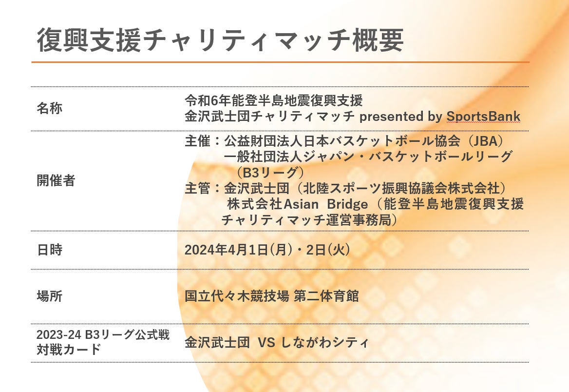 震災を受け、この度、石川県七尾市を本拠地とする男子プロバスケチーム「金沢武士団(カナザワサムライズ)」(B3リーグ所属、北陸スポーツ振興協議会株式会社)と協働し、『令和6年能登半島地震 復興支援チャリティマッチ』を企画、開催する運びとなりました。