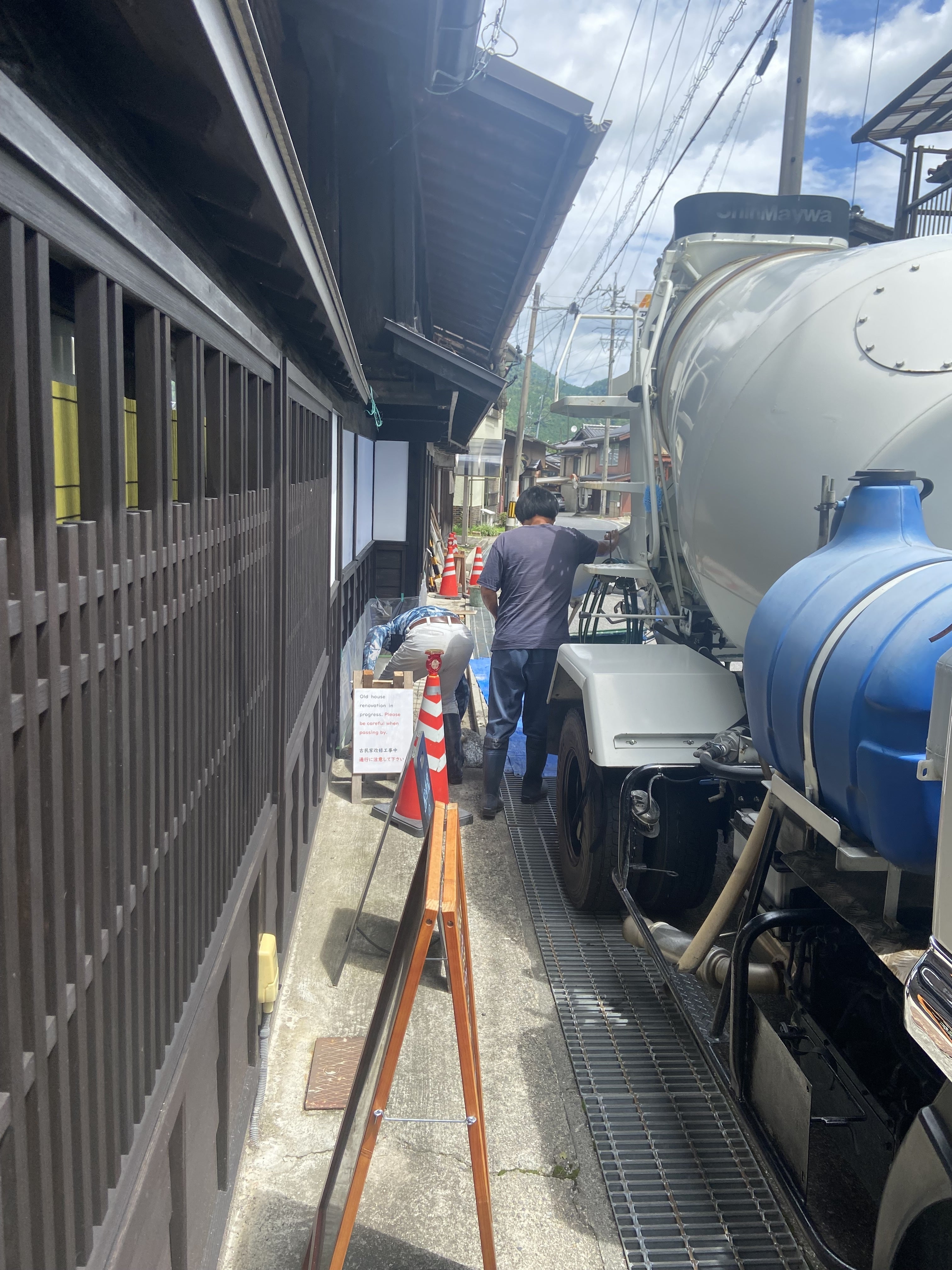 バイク置き場にもなる玉を含めたところに左官屋さんが入って固めていってます。