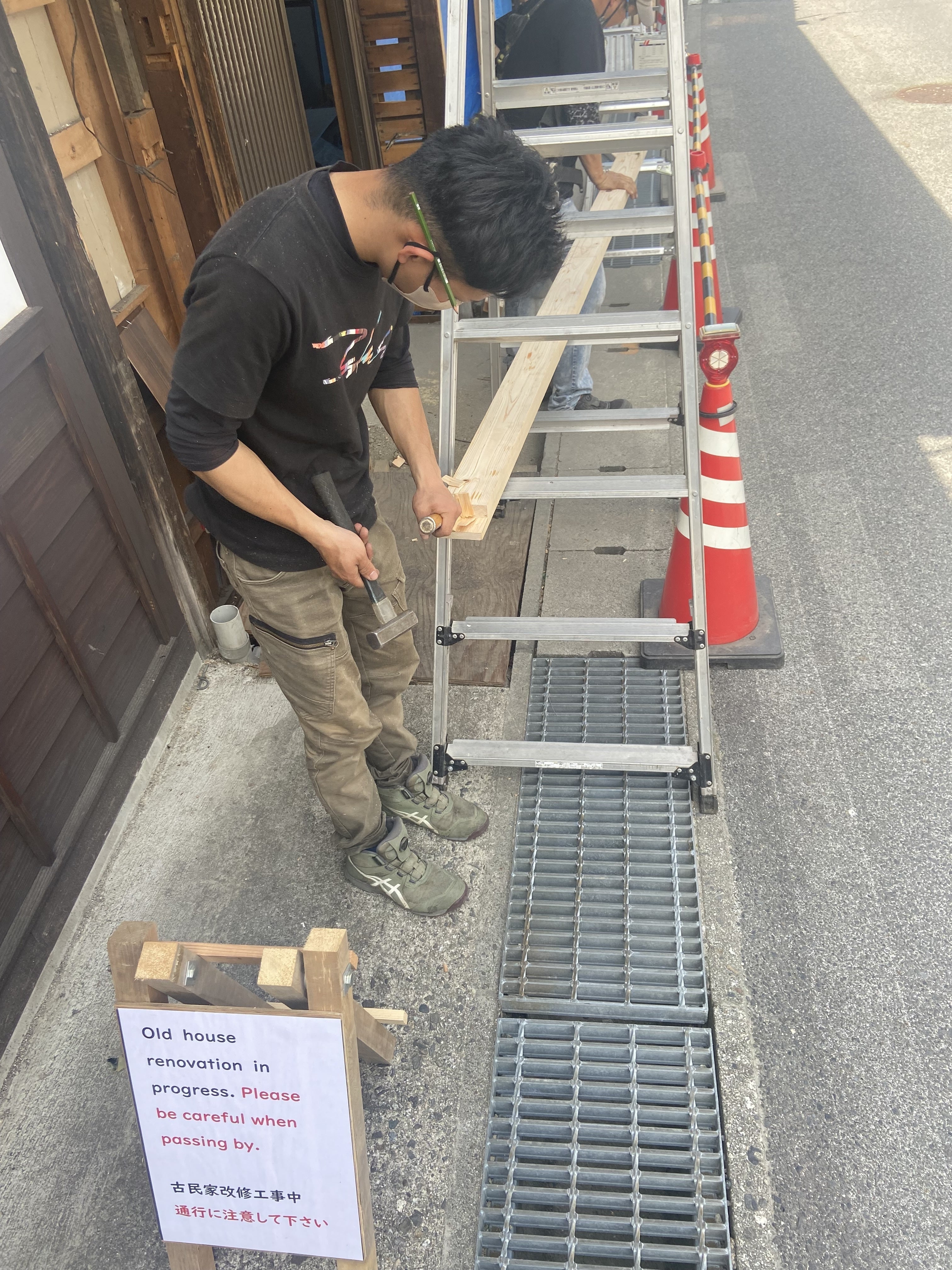 通りに面した壁が少しづつ出来上がってきました!壁ができると一気に建物感がでてきますね。耐震の関係で、出入り口の場所を変えたりしております。作業中に変わっていくのも古民家あるあるですが、設計士さんが大工さんだと本当にレスポンスが早くて本当に助かります。