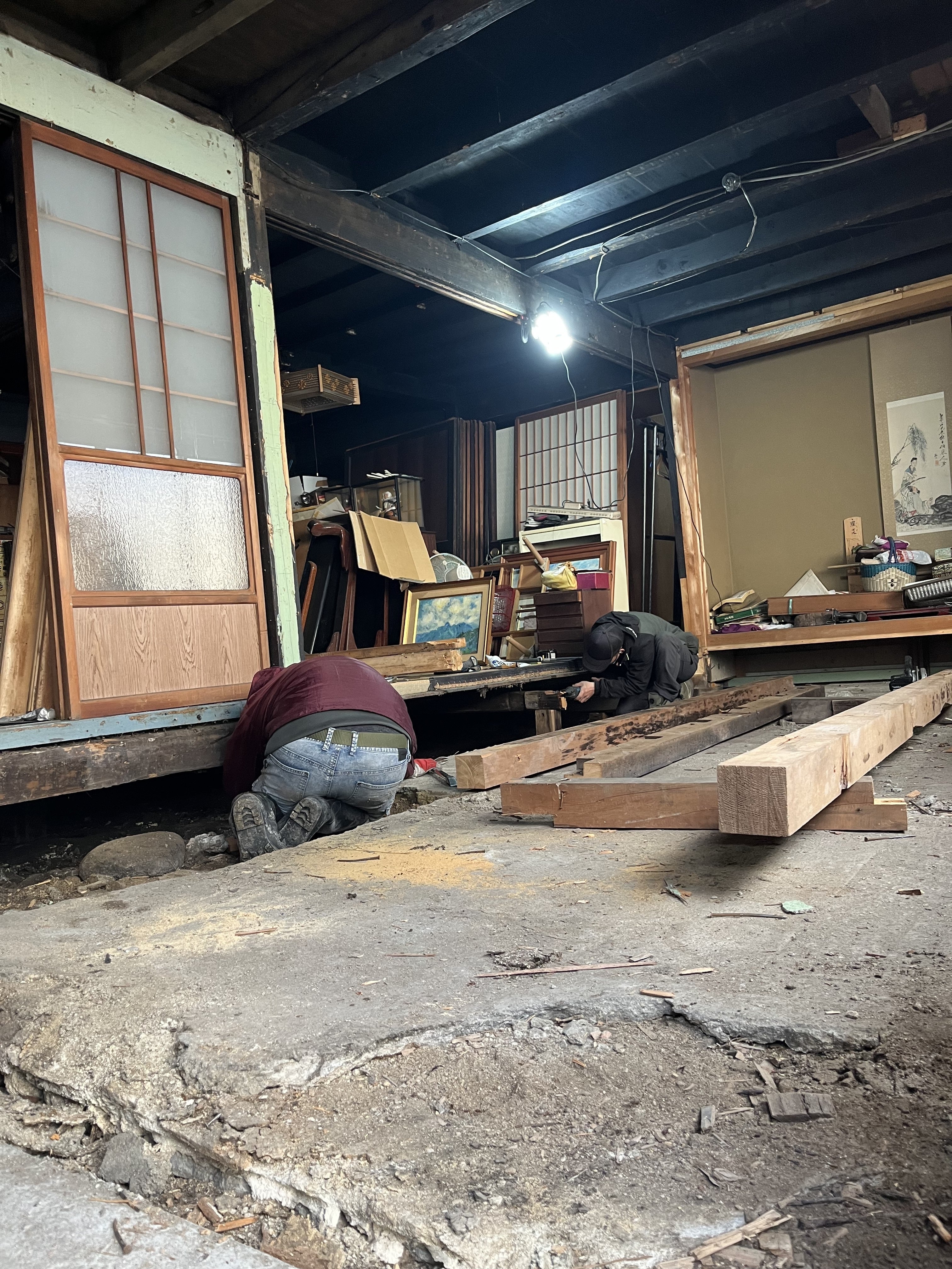 元々お豆腐屋ということもあり、通りに面した部屋の部分は土間が残っておりました。こちらは綺麗に直してバイクも停められるロビーに変身していきます!6台前後は停められるスペースがあるので、ちょっとした修理も可能かも?