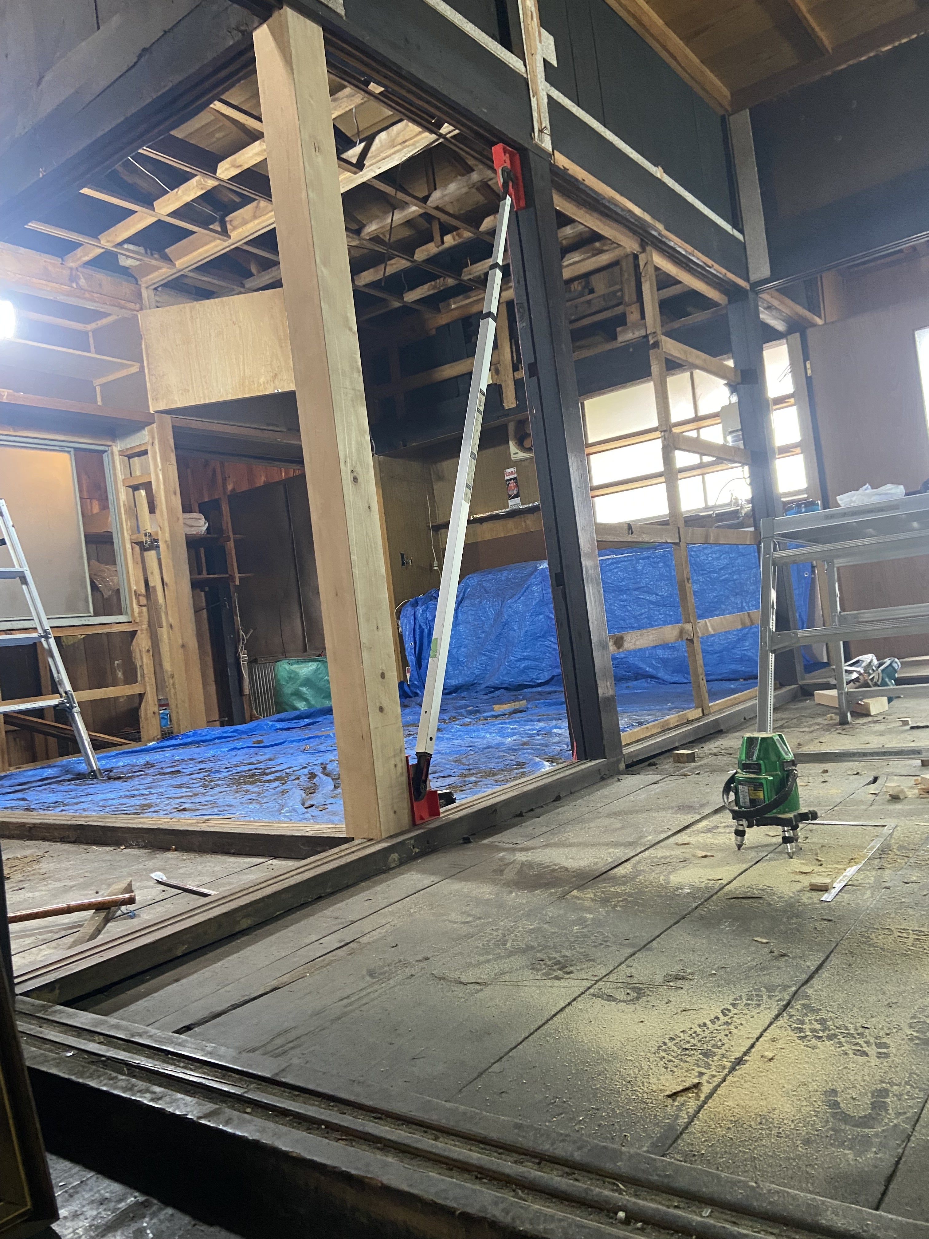 昔、囲炉裏があった場所は吹き抜けになっていて、天窓から灯りが差し込むようになっています。囲炉裏も吹き抜けも天窓も、上手に生かして行けたらいいなぁと大工さんと関係各所と相談をしながら改修を進めております。図面も改修を進める中で変わっていくところがありますので、随時ご報告していきます!