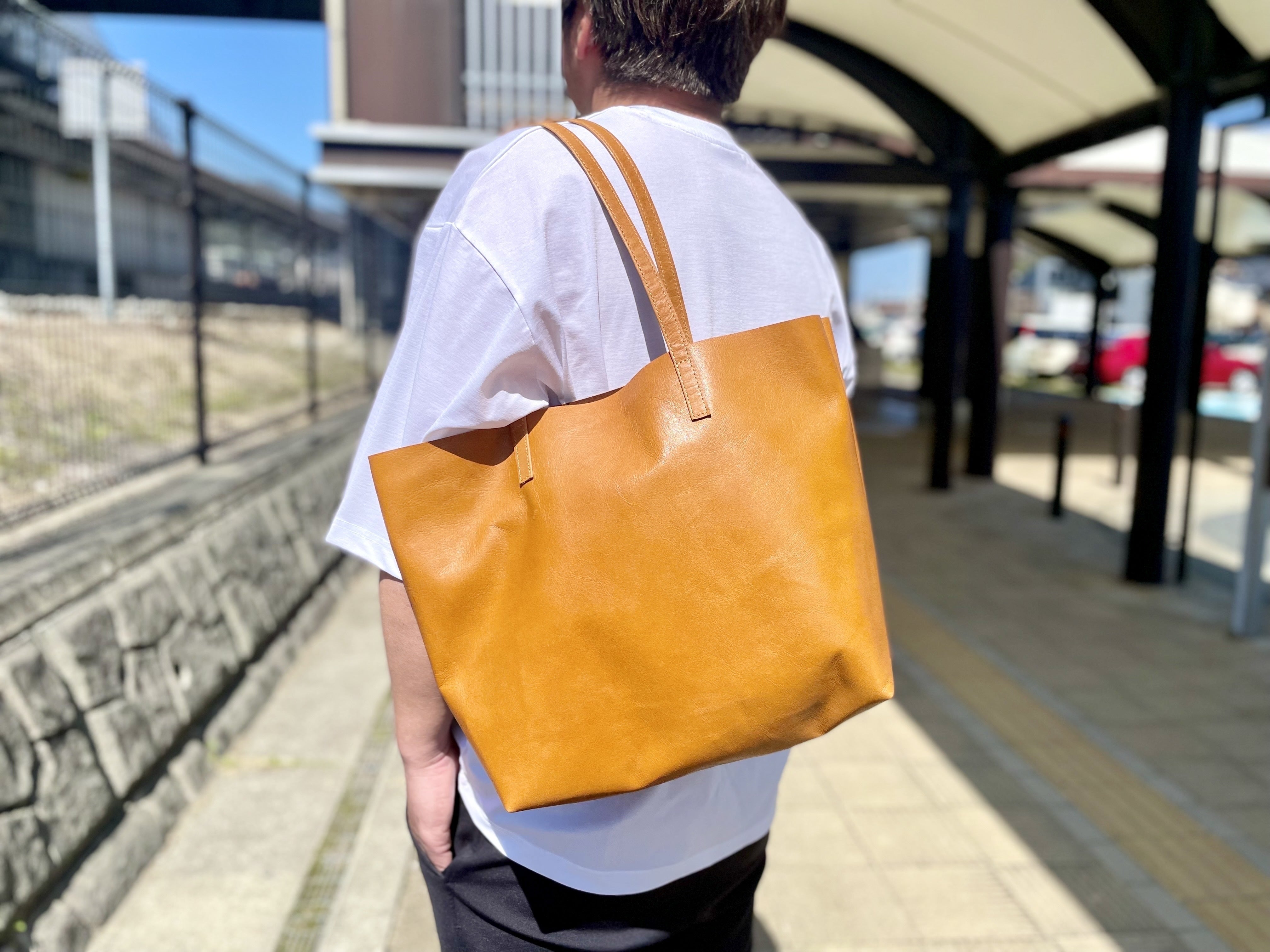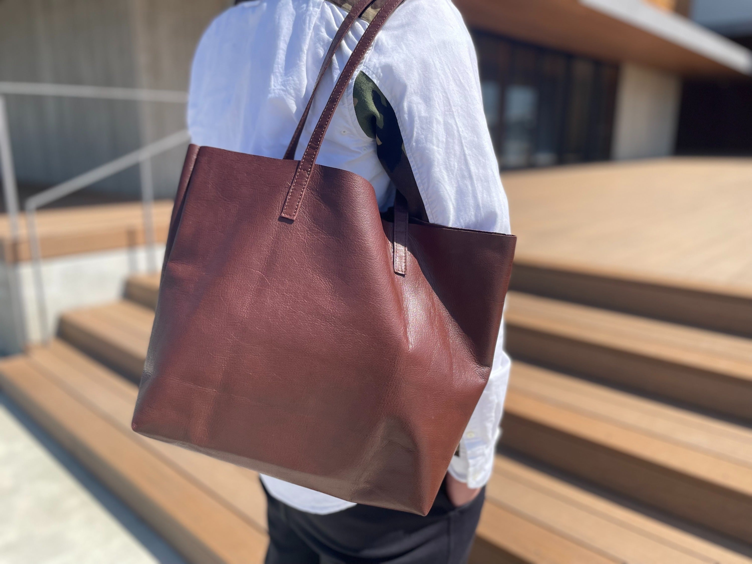 とくに今回のように大きめトートバッグの場合には、内容物によってバッグの見え方が変化し、クシュっとして体に沿う時や張りがあってふっくら見える時など、様々な革の表情が楽しめます。