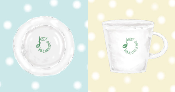 このリターンの為に製作したhatomameロゴ入りのマグとケーキ皿です。