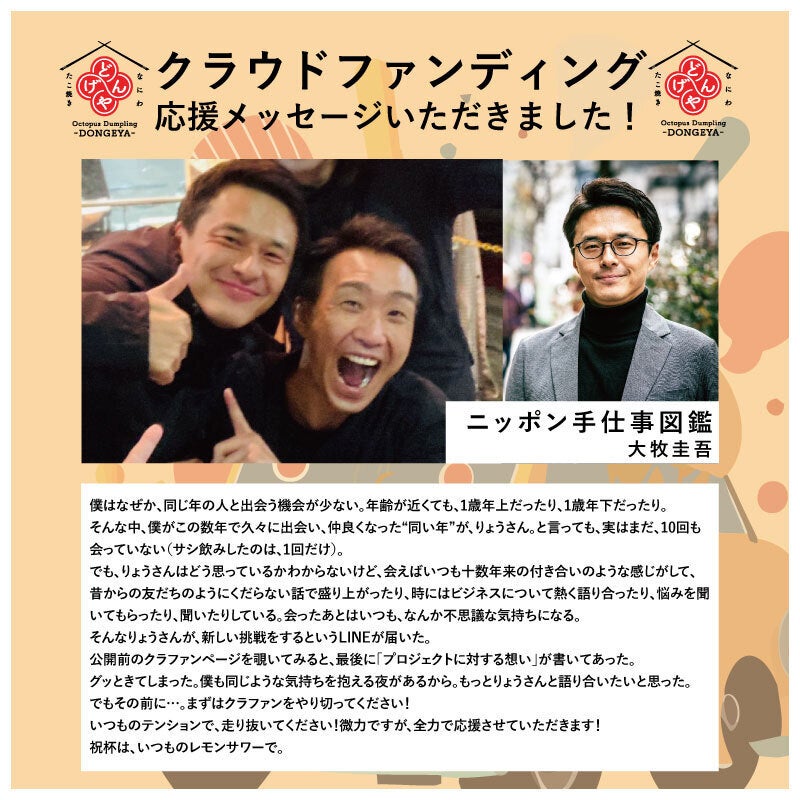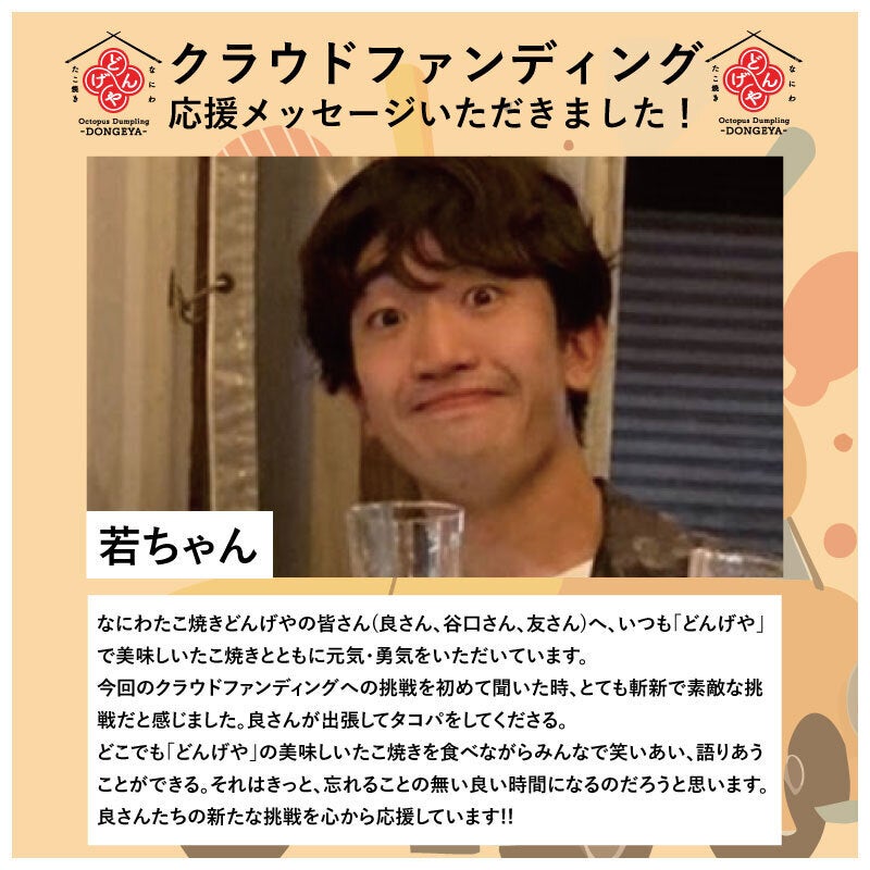 クラウドファンディングがあったからこそ、この出張たこパーを企画することができました。どんげやのリターンがあなたの家族や友達、仕事仲間や多様な交流、新たなつながりの場、そして懐かしい面子が集まれる機会になることを願っています。