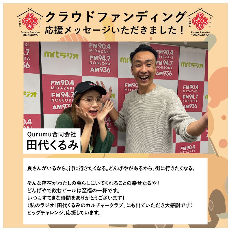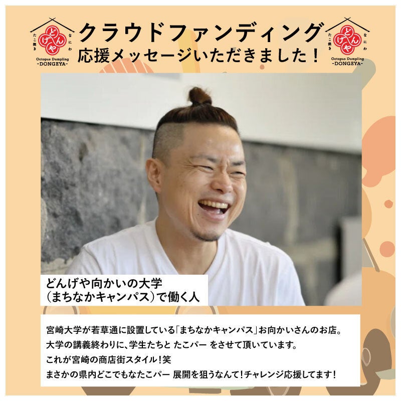 僕は19歳の時に大阪をでて、宮崎の地に足を下ろし27年が経ちます。自分のことを好きにさせてくれた宮崎。好きじゃない自分の良くないところも許せた宮崎。大好きな宮崎。お世話になった人は数知れず。もう全員に恩返しすることもできない。だから、宮崎の為に何かしたい。たこ焼きやたこパーを通して宮崎に居る誰かの何かの役に立ちたい。そして、あなたにありがとうを言いに会いにいきたい。