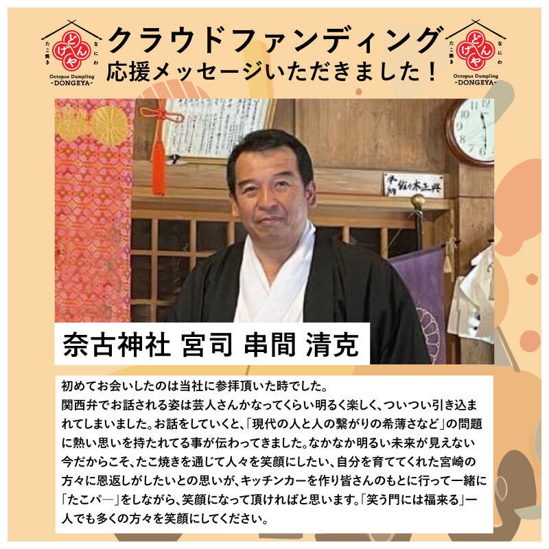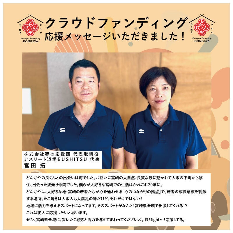僕は19歳の時に大阪をでて、宮崎の地に足を下ろし27年が経ちます。自分のことを好きにさせてくれた宮崎。好きじゃない自分の良くないところも許せた宮崎。大好きな宮崎。お世話になった人は数知れず。もう全員に恩返しすることもできない。だから、宮崎の為に何かしたい。たこ焼きやたこパーを通して宮崎に居る誰かの何かの役に立ちたい。そして、あなたにありがとうを言いに会いにいきたい。