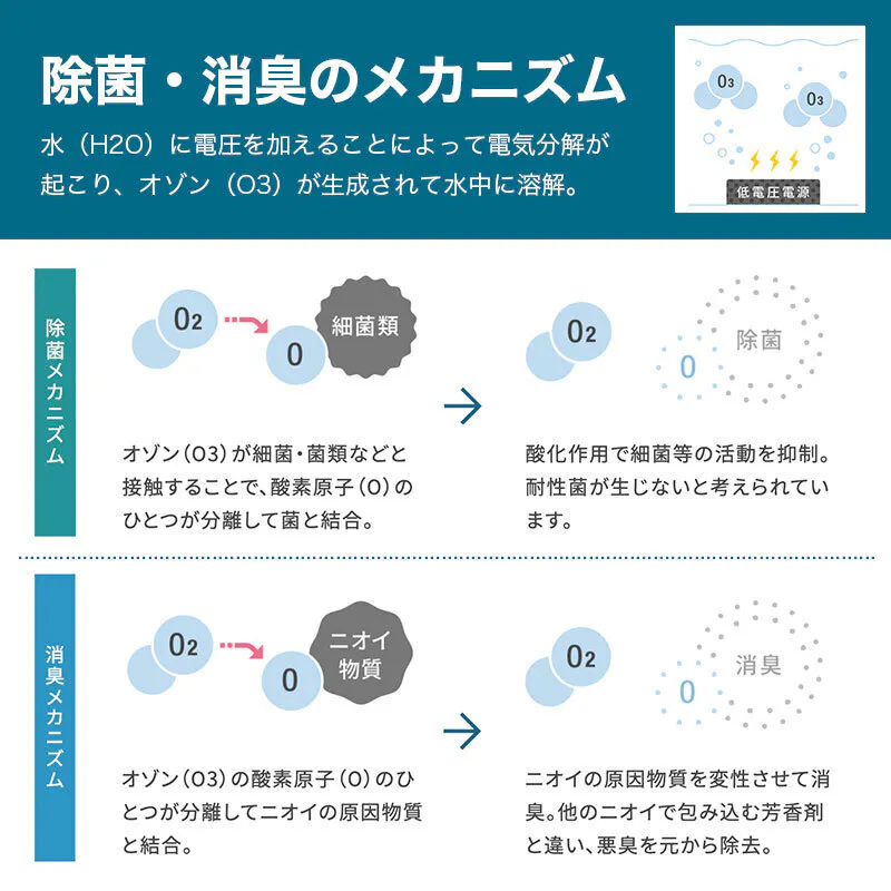 オゾンは自然界にも存在する身近な成分で酸化力が強く、ニオイの元と結びつき分解する作用があるため、悪臭の根源から消臭を叶えます。 時間がたてば水と酸素に戻るので、人体への負担もありません。