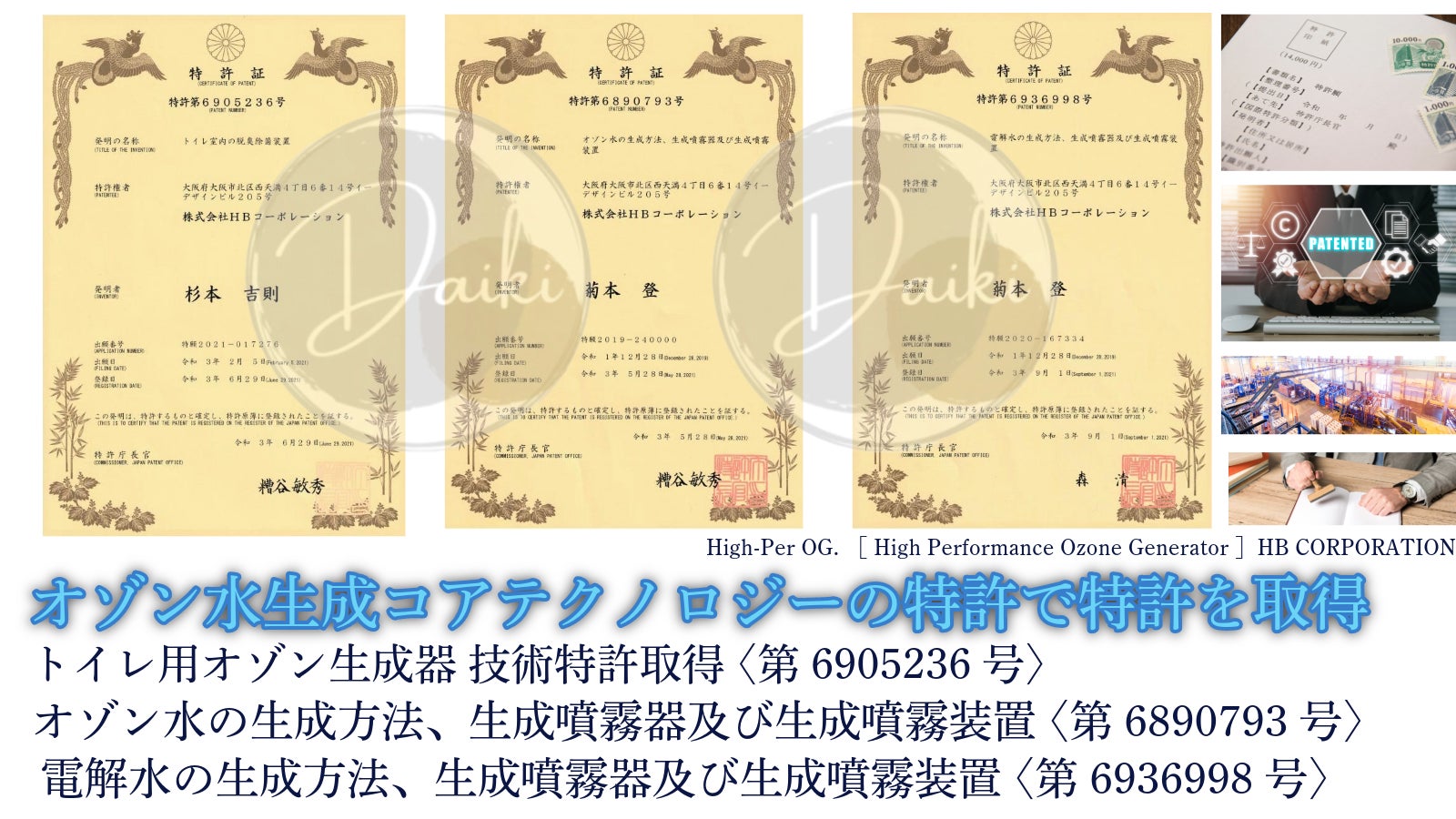 HBコーポレーションの特許コア技術『High-Per OG』を搭載したトイレ用オゾン水生成器は技術特許を取得しております。
