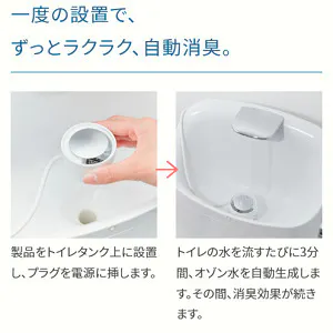 トイレのタンクの上に設置し、水を流すタイミングで自動的にオゾン水を生成