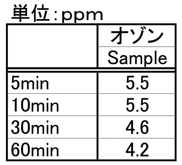 ⇒ 試験の結果、オゾン生成2分後には検知できないオゾン濃度(0.05ppm以下)になりました。