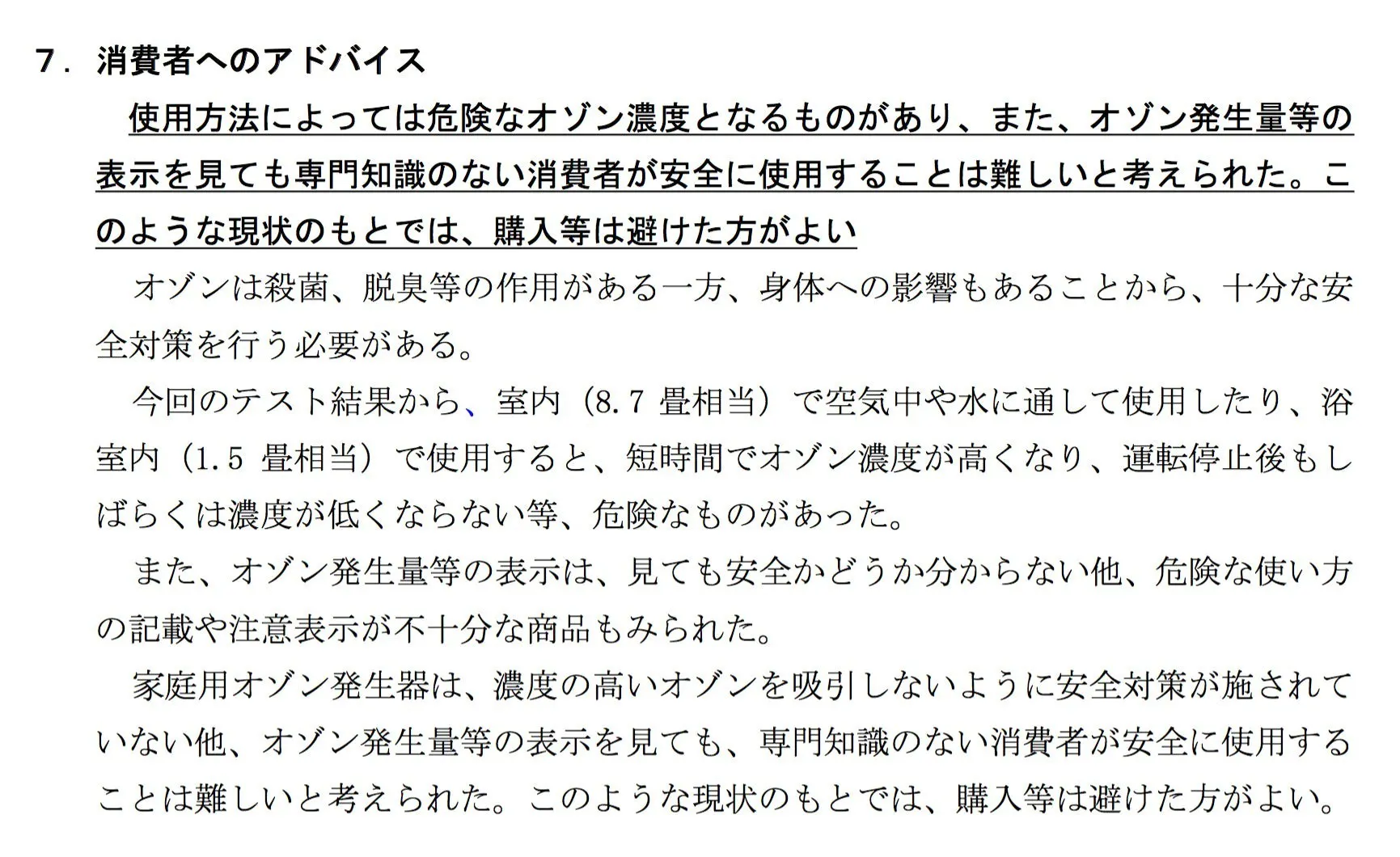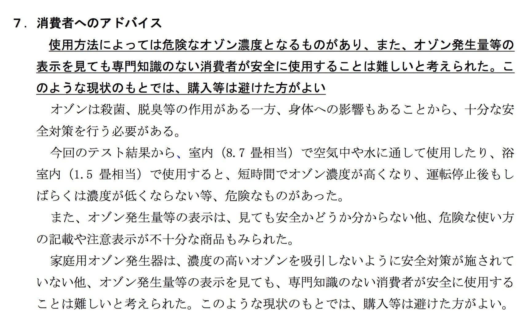 特にトイレ内は密室空間なので、低濃度のオゾン生成器であっても空気中にオゾン放出は、トイレの換気を十分出来なかった場合を危惧して、放電タイプの「オゾン発生装置」は設置しないよう国民生活センターで以下のように消費者の皆様に注意喚起がされています。