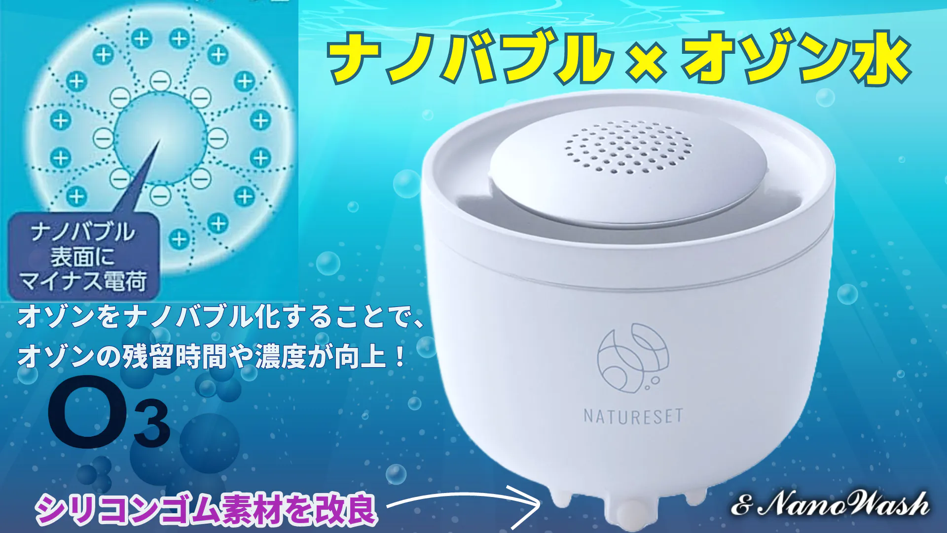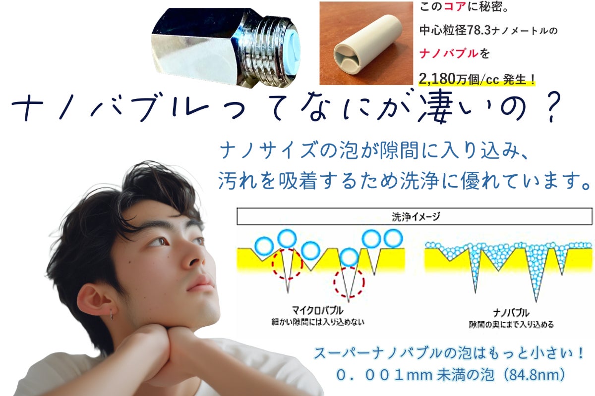 今話題のナノバブルは、水だけでも洗浄能力に優れていることが認められ、洗濯機やシャワー、キッチン水栓等に採用されています。