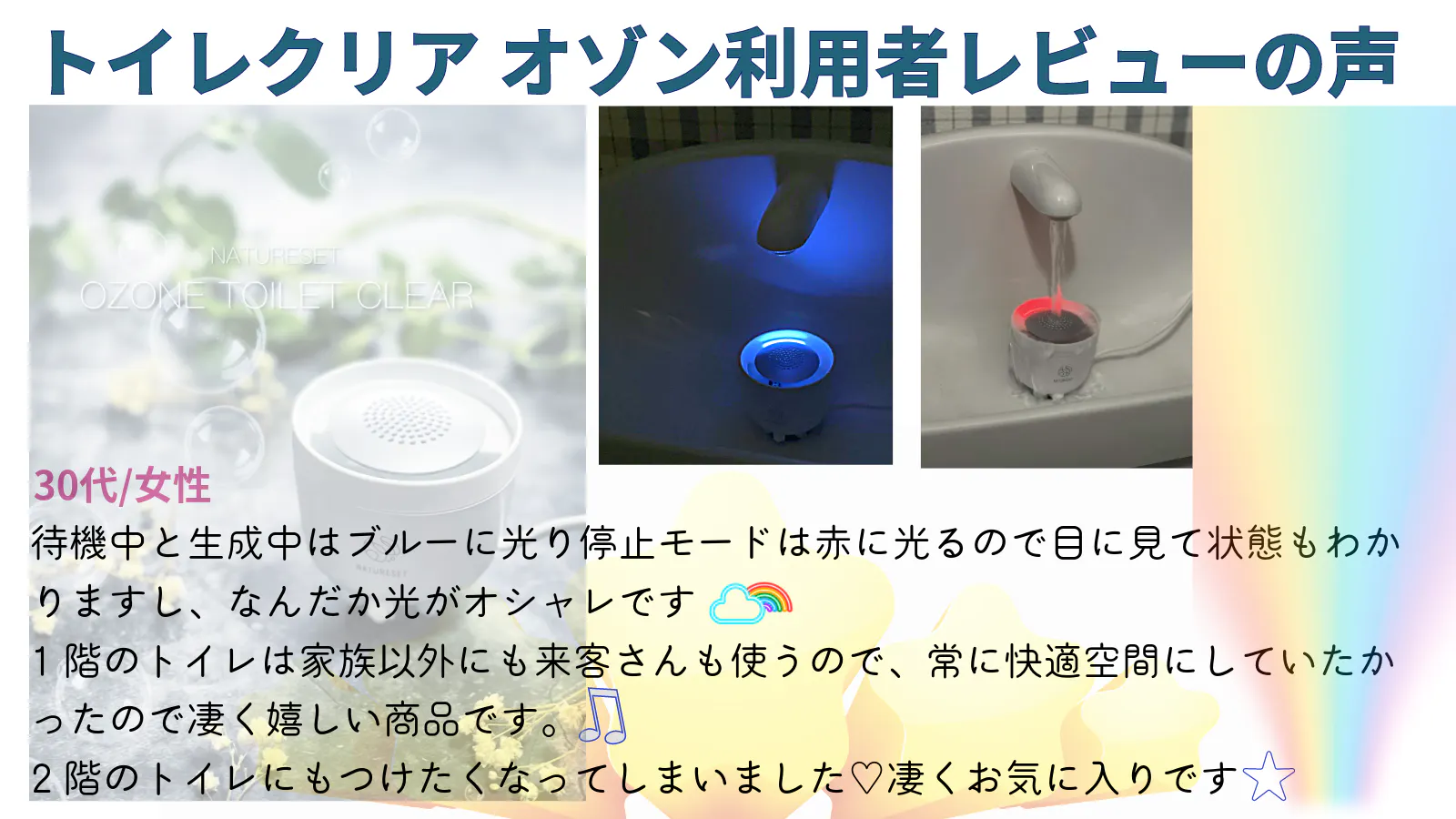 オゾンナノバブルを研究している者です。 オゾンナノバブルの研究は現在世界的に注目されています。 オゾンは、消臭だけに留まらず塩素の約7倍ともいわれる強力な酸化力で有害化学物質を除去する非常に有効で安全なのですが、オゾンを空間にプラズマ放電した場合に限っては、狭いトイレ内では気体濃度0.1ppm以上になる恐れがありその場合オゾンは有害ガスになり得る事も考えられます。 その点、こちらの商品はオゾン放電による気体では無く、オゾン水の状態であり自動生成の仕組みであれば、濃度において安心出来ます。 またナノバブルによって長期間オゾンが酸素に戻らずナノバブルに閉じ込められた状態のままで水中に滞在させておける点も非常に優れているシステムだと感じ関心しています。 御社商品に更なる開発も大いに期待しています。