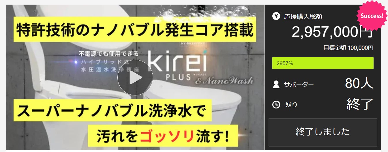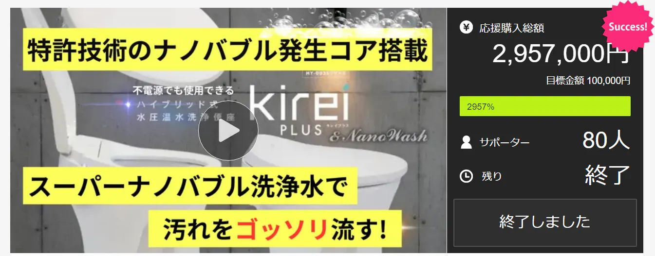ナノバブルを採用したハイブリッド式温水洗浄便座は、2024年クラファンで300万円近くの支持を集めました。