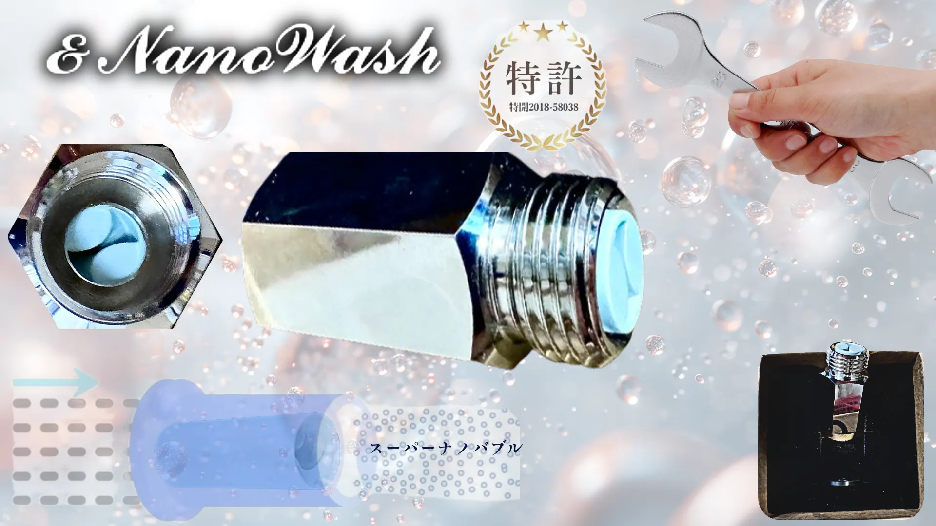 スーパーナノバブル発生装置「&NanoWash」は、取り付けることで、おしりやビデに使うノズル洗浄水を「スーパーナノバブル化」して綺麗に洗浄します。※取り付けには別途スパナが必要です。