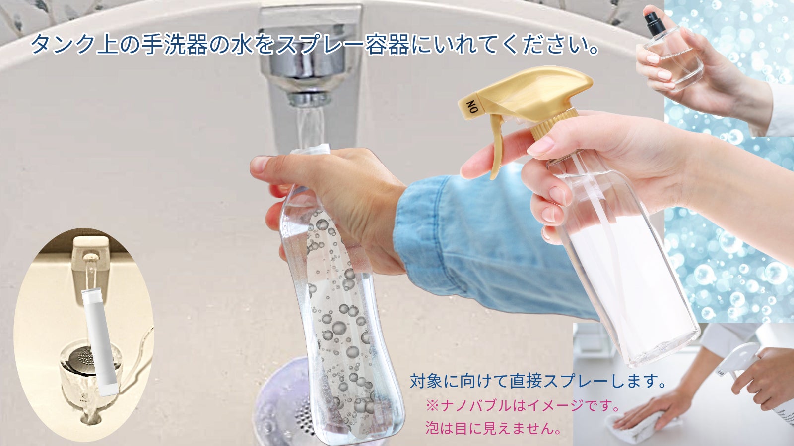 タンクの手洗い場のスーパーナノバブル化した水は、手洗いの他、スプレーボトルに入れ『ナノスプレー』としてもご利用頂けます。