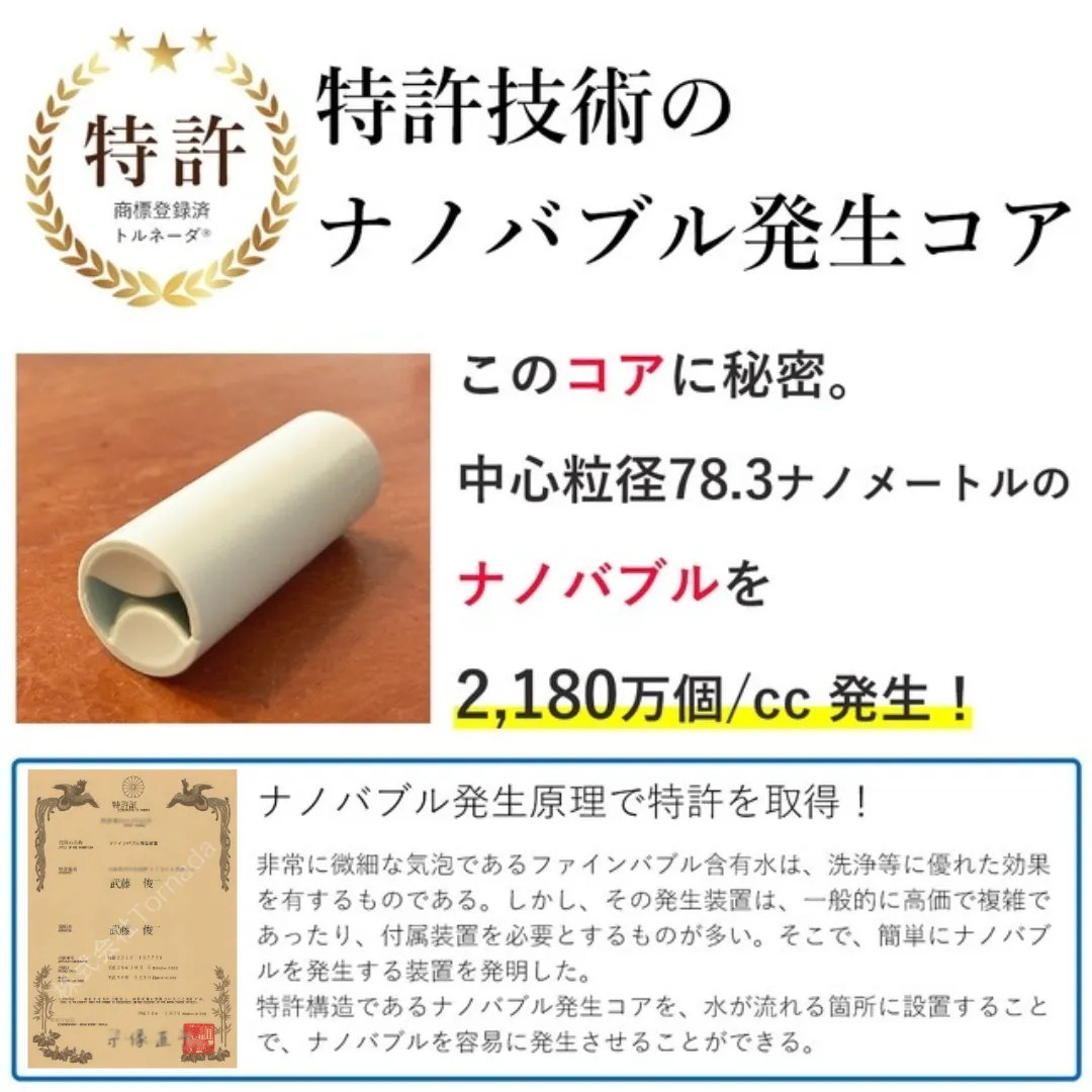 ※(株)Tornadaが特許および「ナノバブル発生トルネーダ®」商標を取得しています。