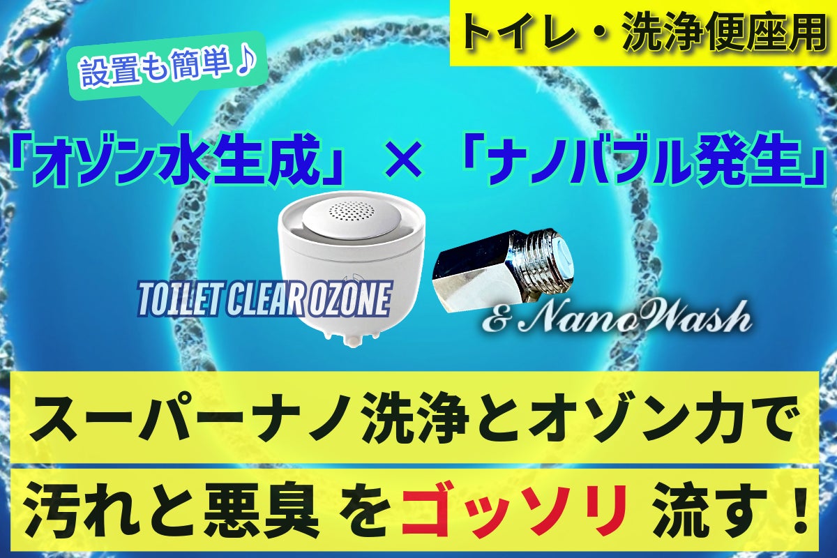 クラファンだけで累計1億円以上の販売実績がある高納商店の自宅の洗濯機やシャワーをスーパーナノバブル化する人気シリーズに待望の『トイレ用モデル』が新登場! さらに複数の特許を持つ『トイレ用オゾン生成器』と夢の技術コラボ♪「洗浄のナノバブル」×「消臭のオゾン」のコンビによる相乗効果をご体感ください!