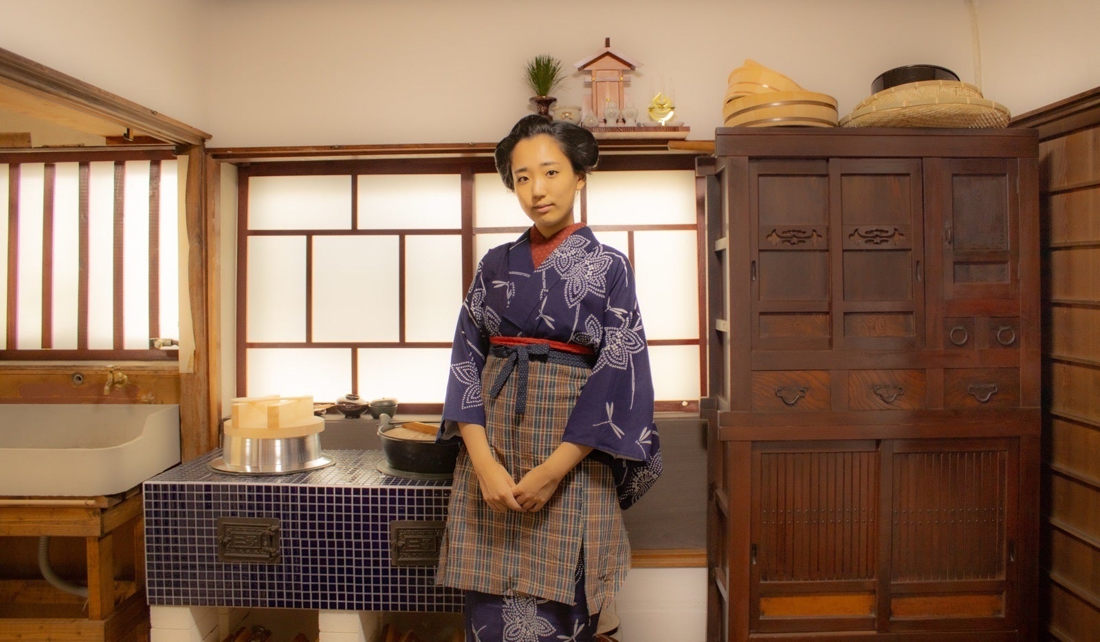 着物にたすきをかけた大正時代のお台所姿で、かまどご飯で作るおにぎりとお味噌汁の体験ができます(^^)