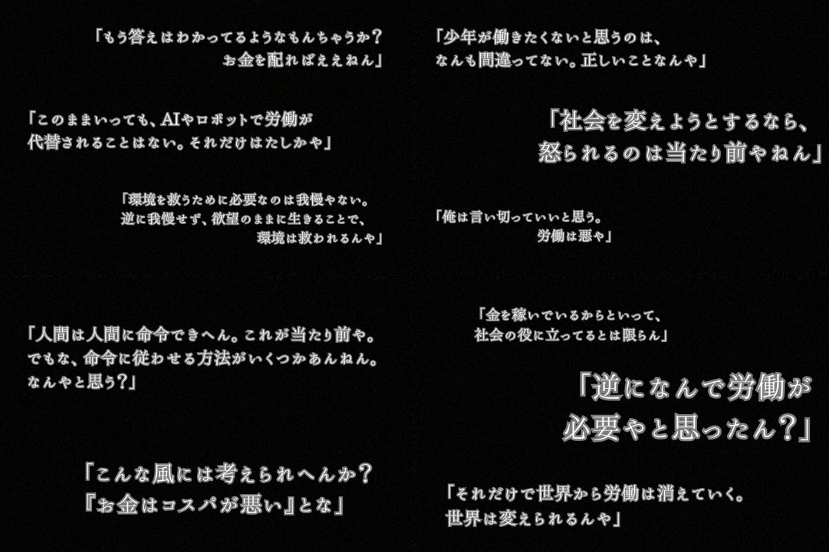 本当にお金のため?/トイレに行くと決めたのは?/あれもこれも欲望/永遠にレベル1の人生/ニートは正義のレジスタンス