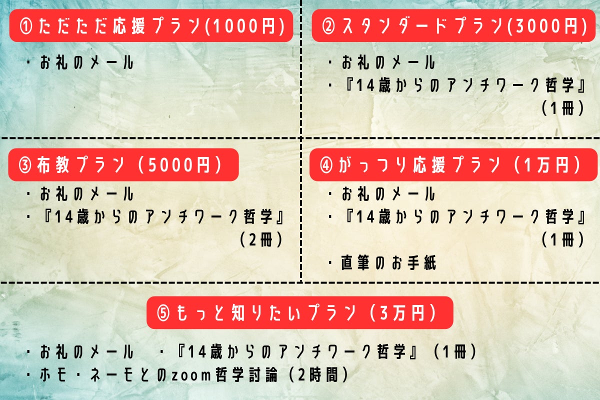 真のリターンは労働なき世界ですが、保証はできません。確実にお返しできるのは、これから出版する『14歳からのアンチワーク哲学 なぜ僕らは働きたくないのか?』です。
