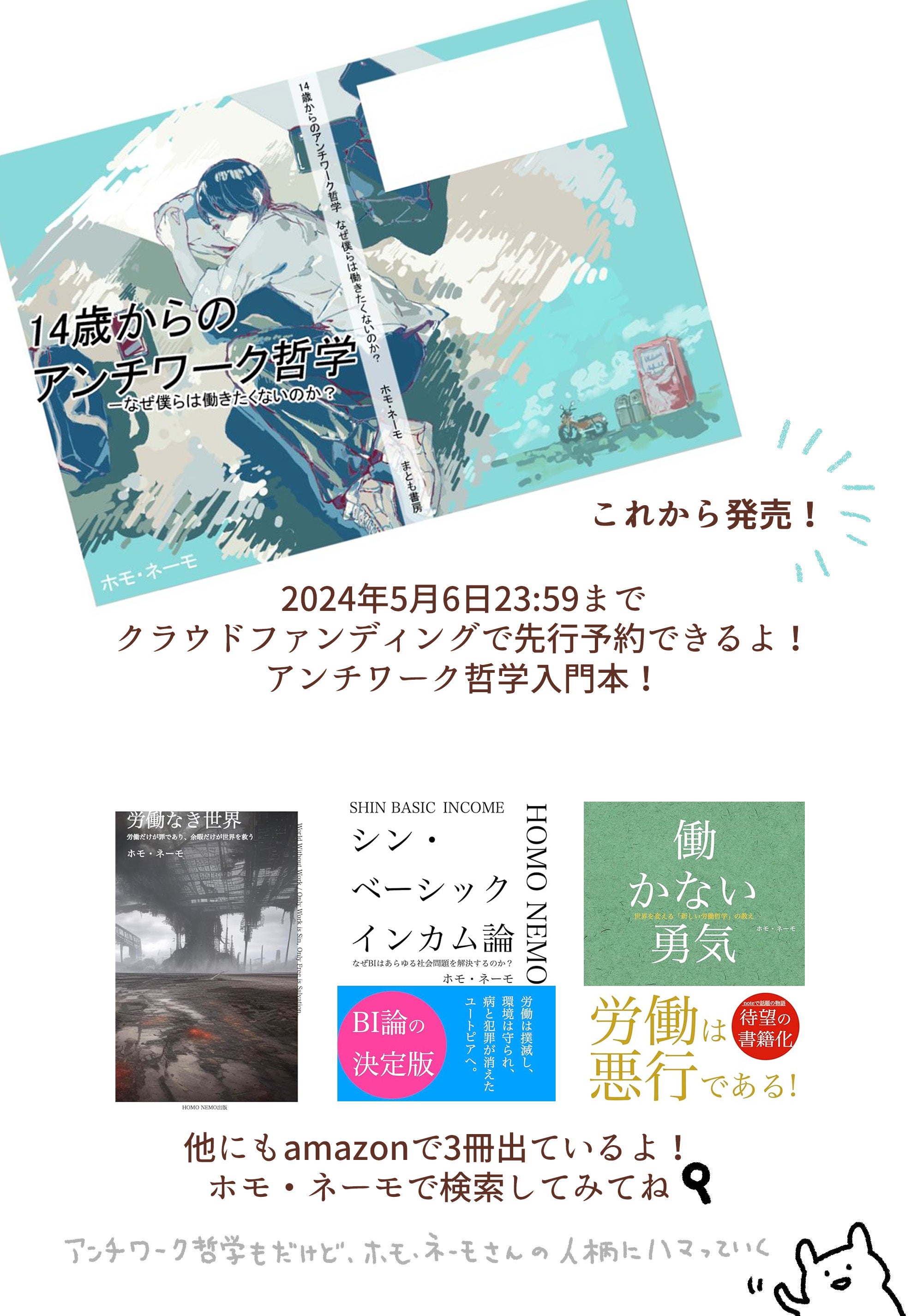 私は本を出版して満足するつもりはありません。労働を撲滅し、この社会のあらゆる問題を解決し、子どもたちに残すに値する素晴らしい社会を作るために、このプロジェクトをスタートさせました。そのための第一歩が『14歳からのアンチワーク哲学 なぜ僕らは働きたくないのか?』の出版なのです。