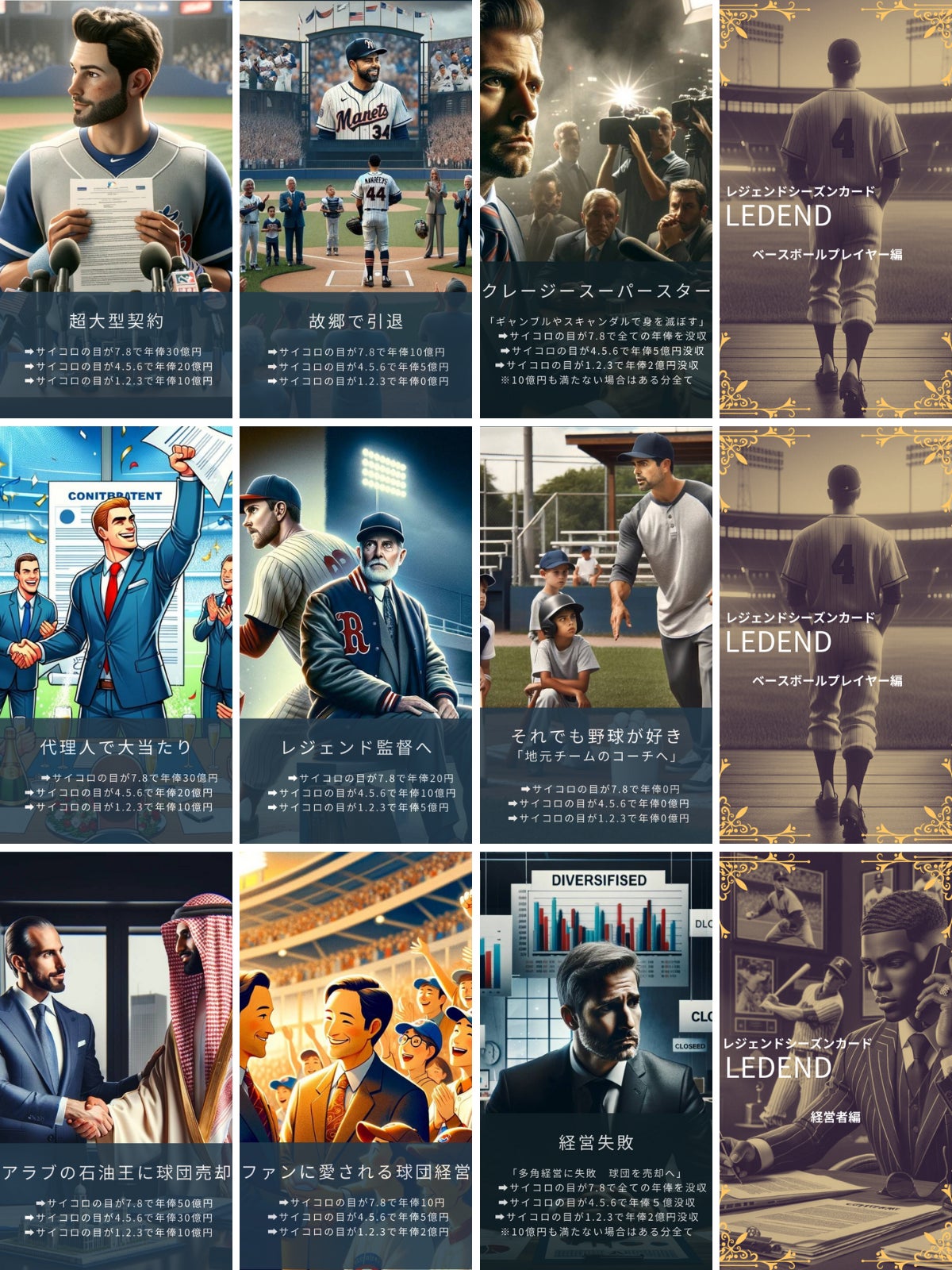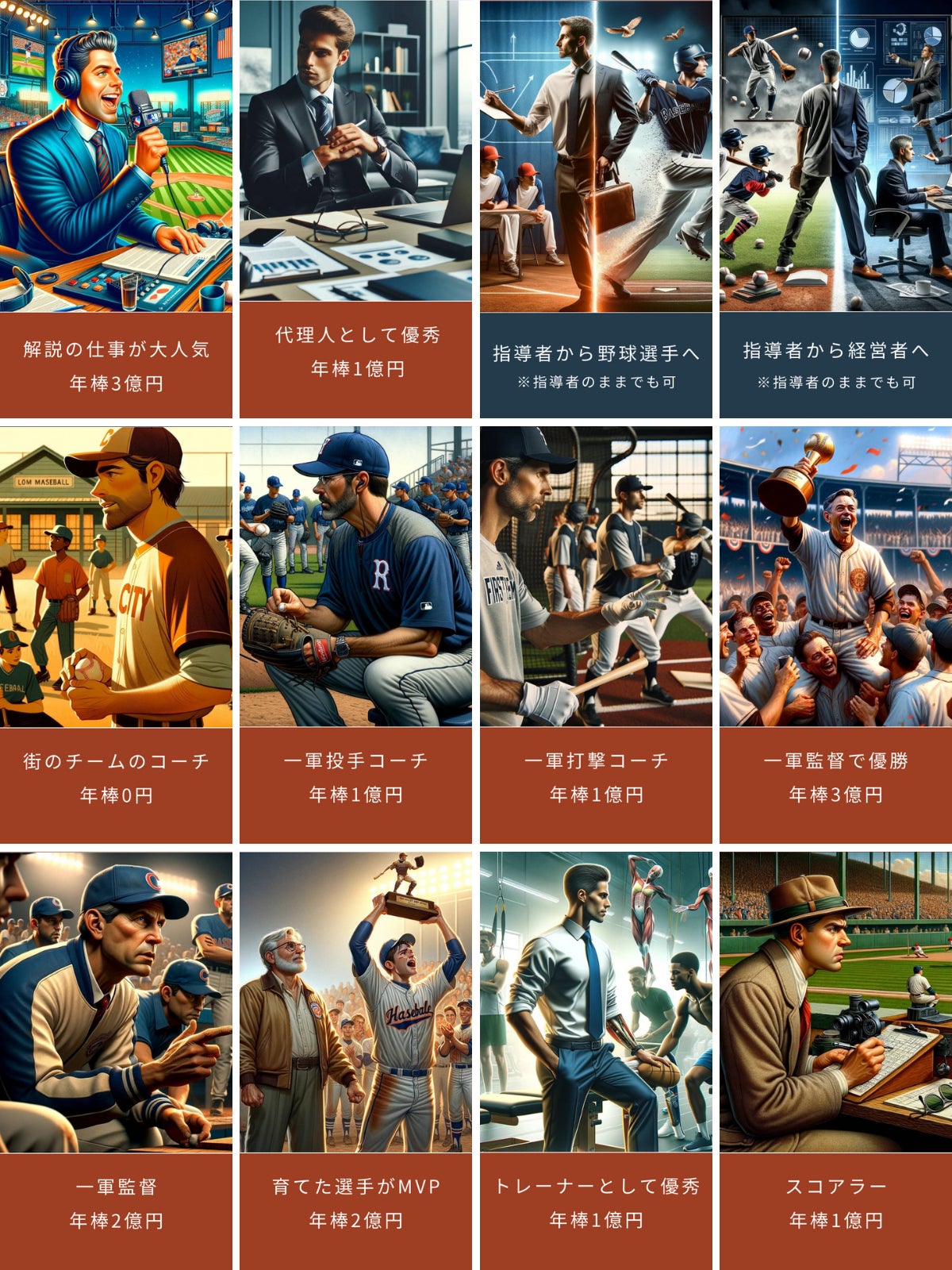 このゲームは、選手になったり、コーチになったり、球団オーナーになったりしながら、「野球」に関わる職業を通じて、お金を稼いでいきます。選手として大成しなくても、思わぬ大逆転があるかも知れません。