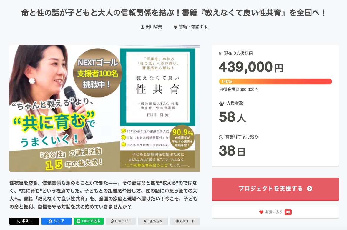 クラウドファンディングスタートから9日が経過し。現在58名のあなたから439,000円のご支援をいただいています。応援、ご協力ありがとうございます!