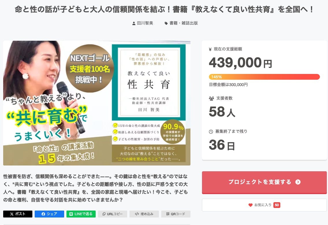 クラウドファンディングスタートから12日が経過し。現在58名のあなたから439,000円のご支援をいただいています。応援、ご協力ありがとうございます!