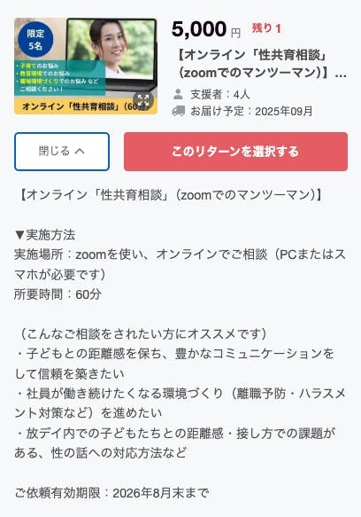 リターンの「オンライン性共育相談」も残り1名となっていますので、必要であればおっしゃってください。疑問や質問などあればいただけると嬉しいです。