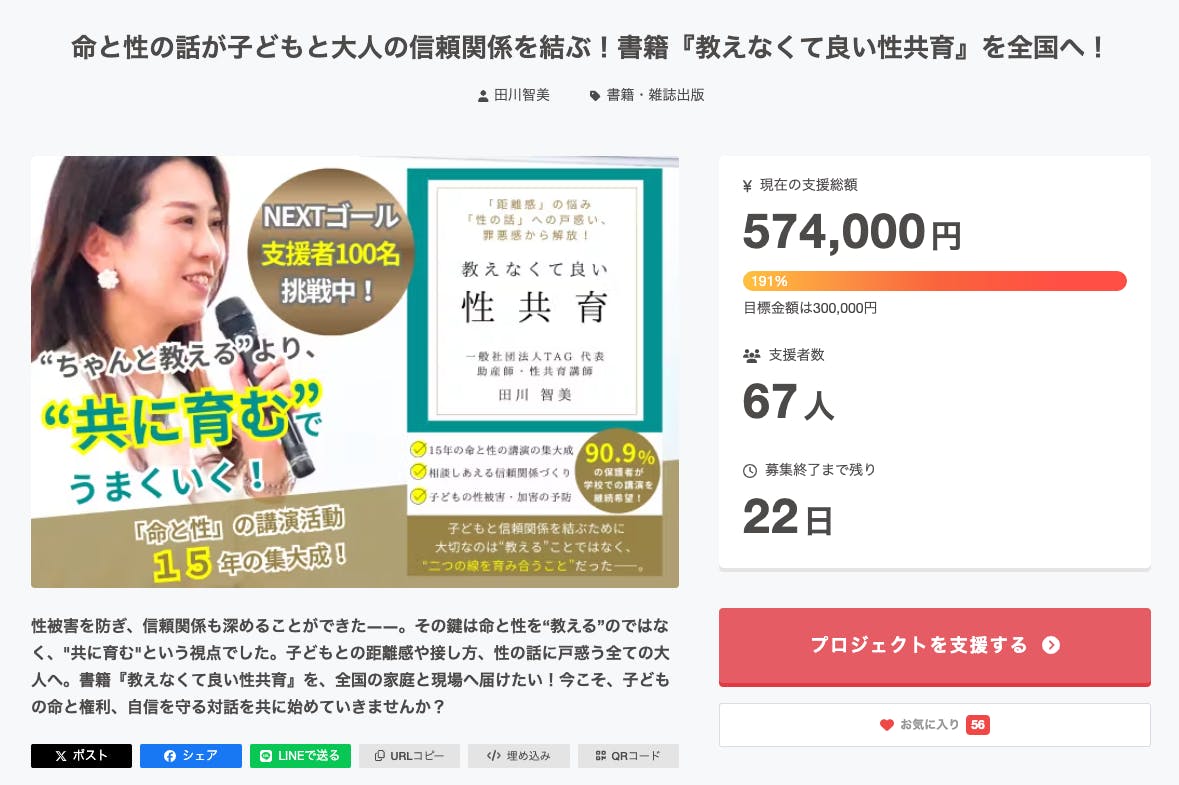 クラウドファンディングスタートから25日が経過し、現在67名のあなたから574,000円のご支援をいただいています。応援、ご協力ありがとうございます!