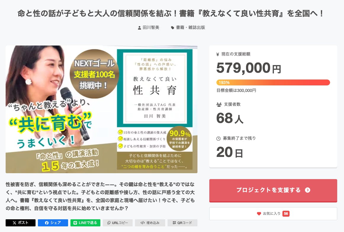 クラウドファンディングスタートから27日が経過し、現在68名のあなたから579,000円のご支援をいただいています。応援、ご協力ありがとうございます!