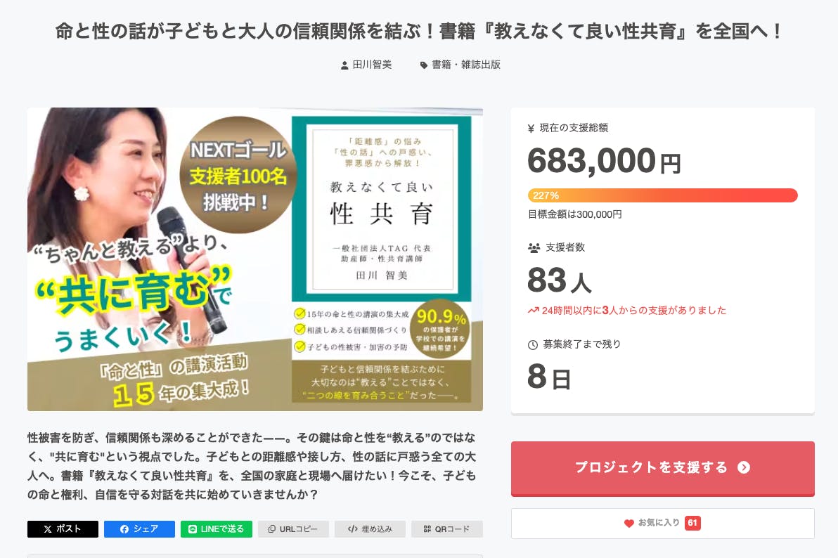 スタートから39日が経過し、現在83名のあなたから683,000円のご支援をいただいています。応援、ご協力ありがとうございます!