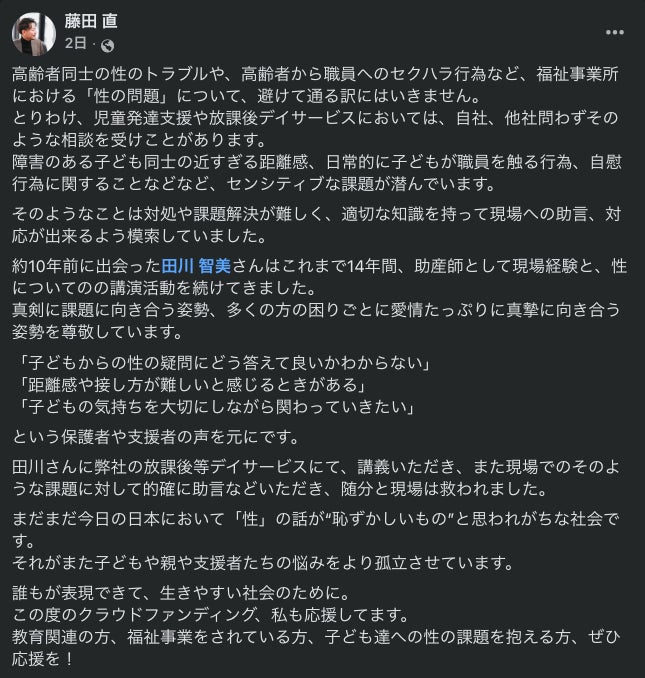 藤田社長の投稿には、現場で実際に感じられている「性」や「距離感の課題」を目の当たりにされていることと、現場を支える必要性が、真剣かつあたたかい言葉で綴られていました。その想いが、高橋さんの心にも届き、ご支援へとつながったのだと感じています。