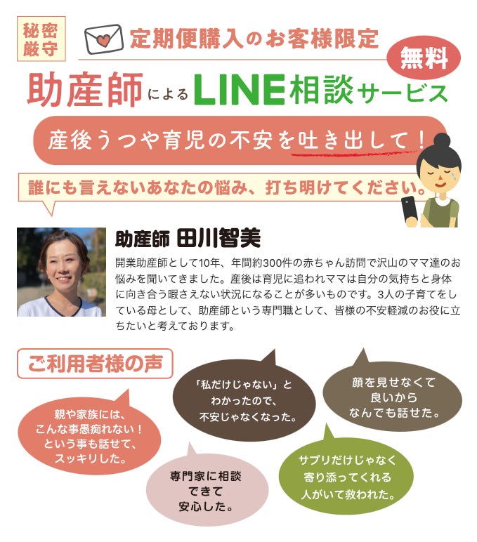 さらにAct One様は、産後・育児専用サプリメント「ママの素」を展開し、LINE相談を通じて産後うつや育児の不安に寄り添う活動も行っています。田川も助産師として、このLINE相談と連携させていただいています。