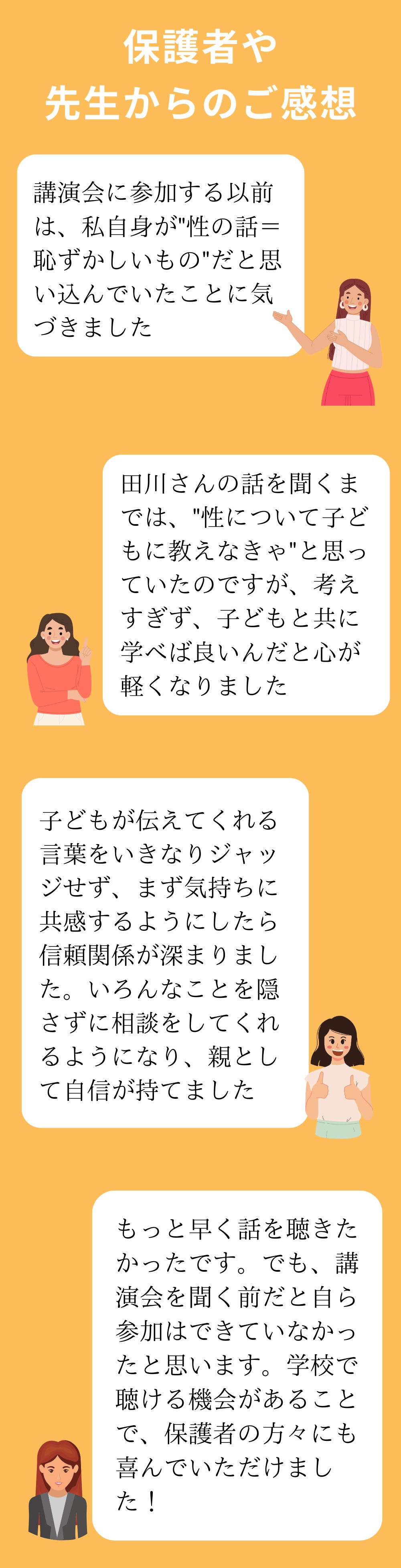 Q9:園児・小学生、中学生や高校生など、年代が違うと「性の話」って変わってくると思うのですが、田川さんは講演活動を経てどんな違いを実感されていますか?