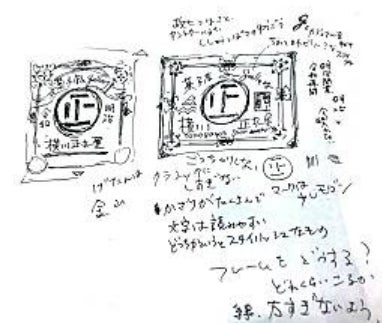 ←「菓子店 & gallery 横川正丸屋」ロゴ考案中のラフ画