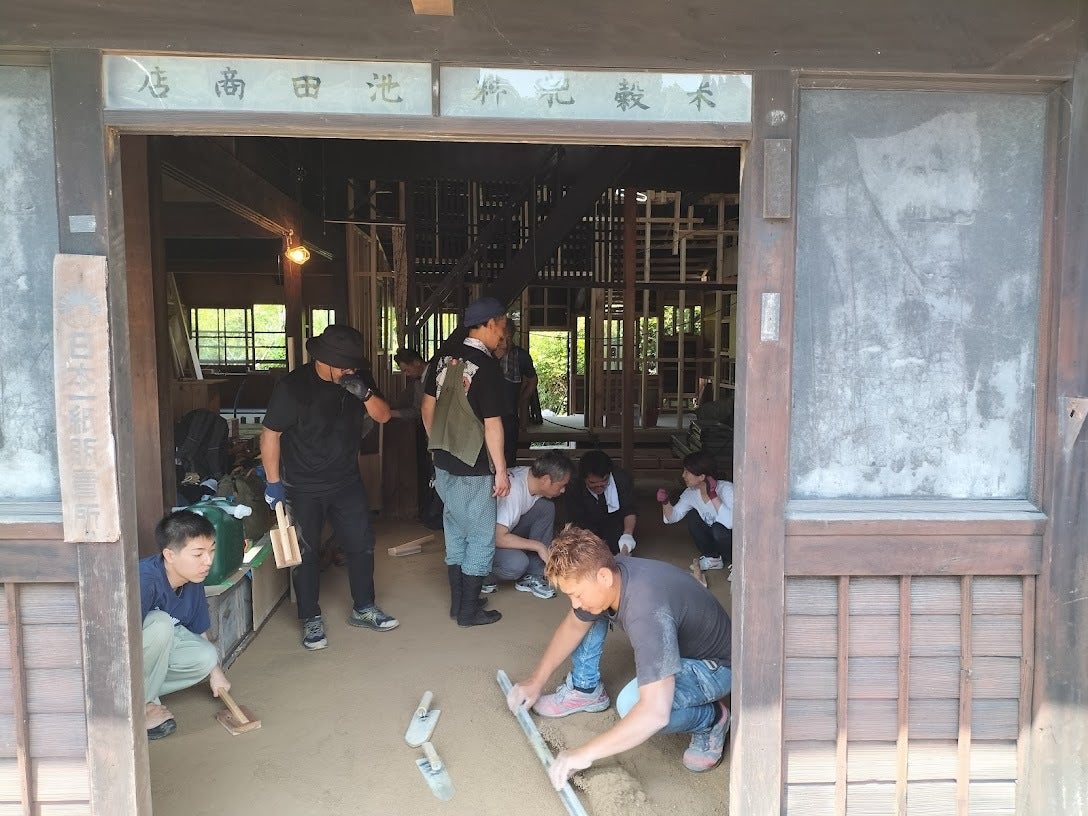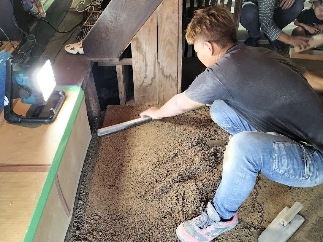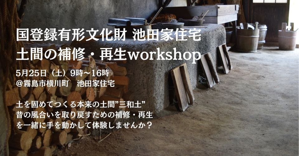 さて、先週土曜日、国登録有形文化財 池田家住宅リノベーションで一番こだわった部分でもある土のままの土間”三和土(たたき)”の補修再生ワークショップを開催しました。