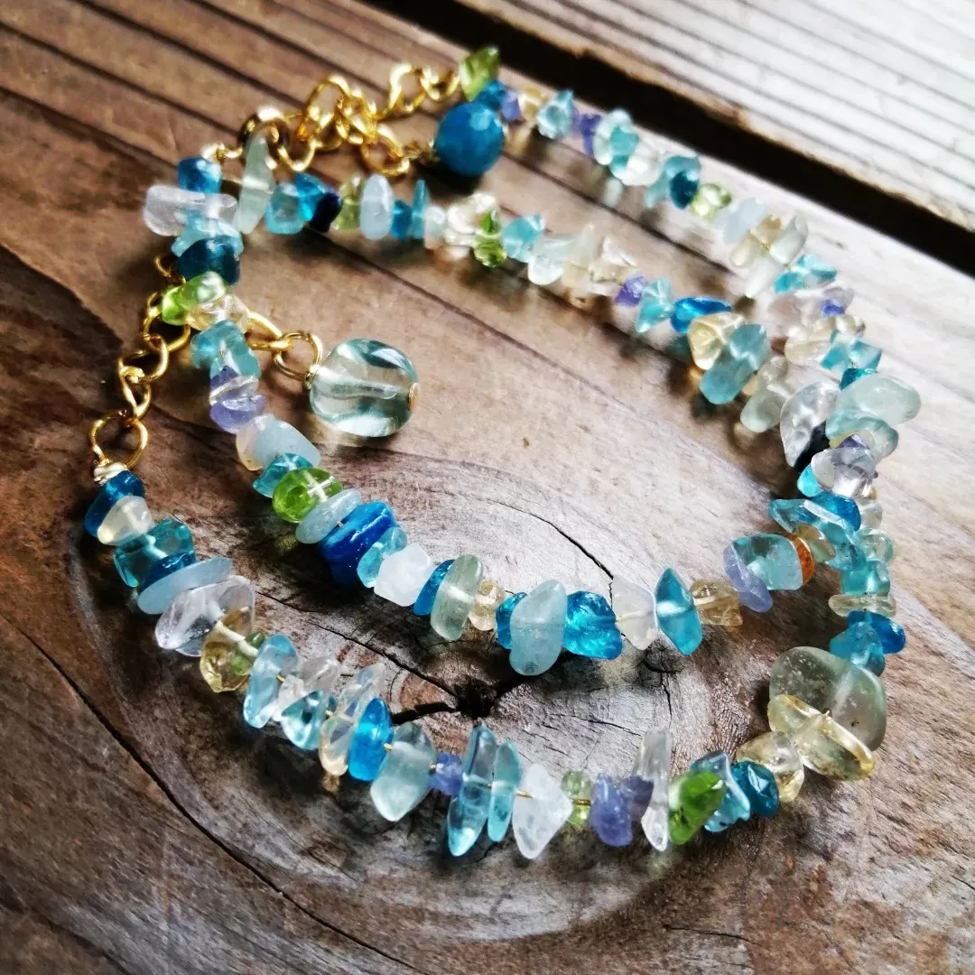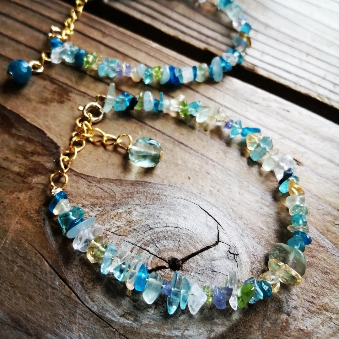 アクアマリン、シトリン、タンザナイト、アメジスト、ラピスラズリ、プレシャスオパール、ペリドット、水晶他… 能登の海を宝石で表した、ブレスレットです。 日々の美しい海、朝焼けの海、夕日の海、海の色の彩りが宝石で表されています。 能登の海は宝石です。いつもそばで感じてもらえたら嬉しく思います。 ※石の並びはランダムになります。ご了承ください。