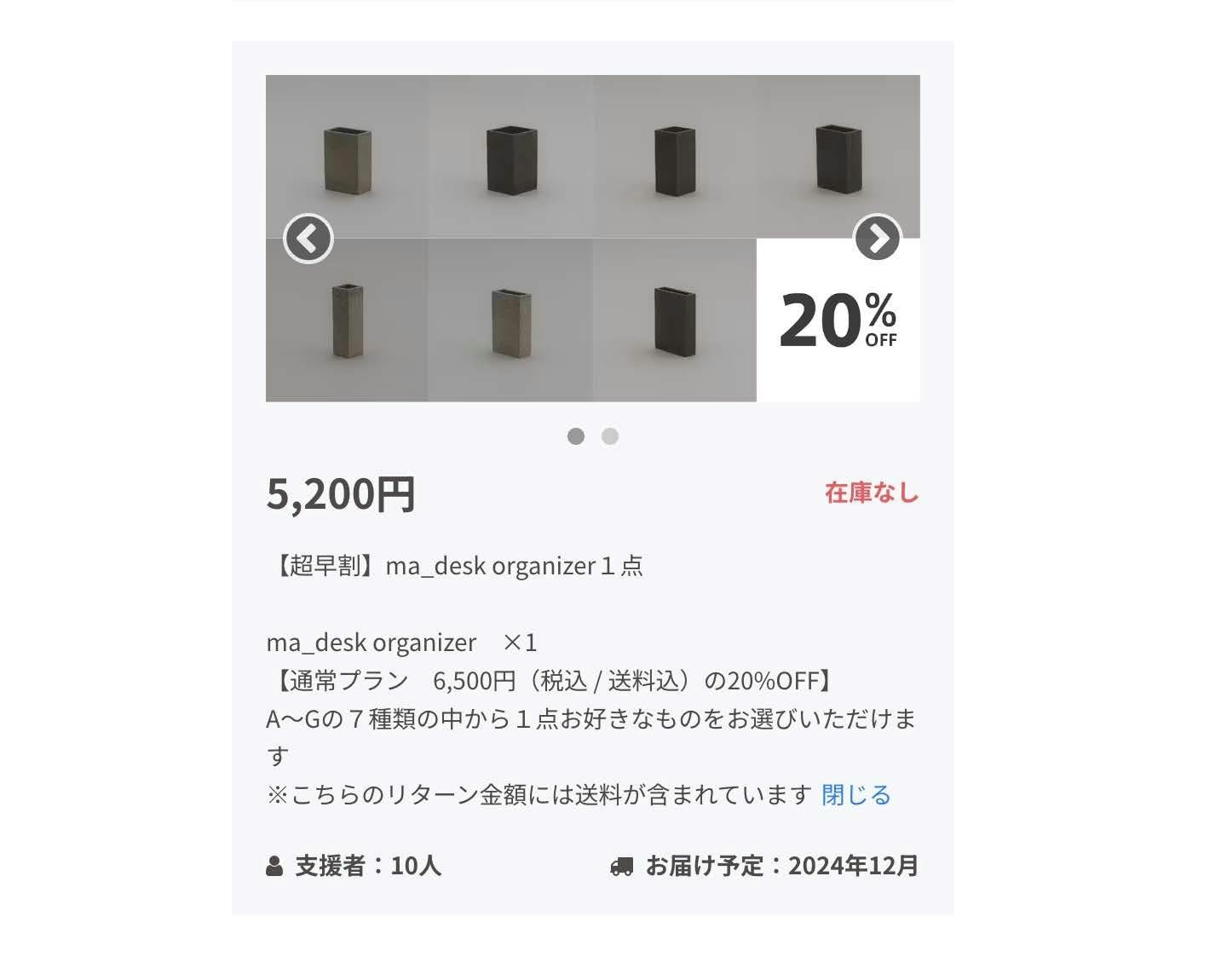 「【早割】ma_desk organizer1点」プラン(通常プラン 6,500円(税込 / 送料込)の10%OFF)をはじめ、他にも様々なリターンをご用意しておりますので、支援をご検討いただいている皆様からのご応募をお待ちしています。