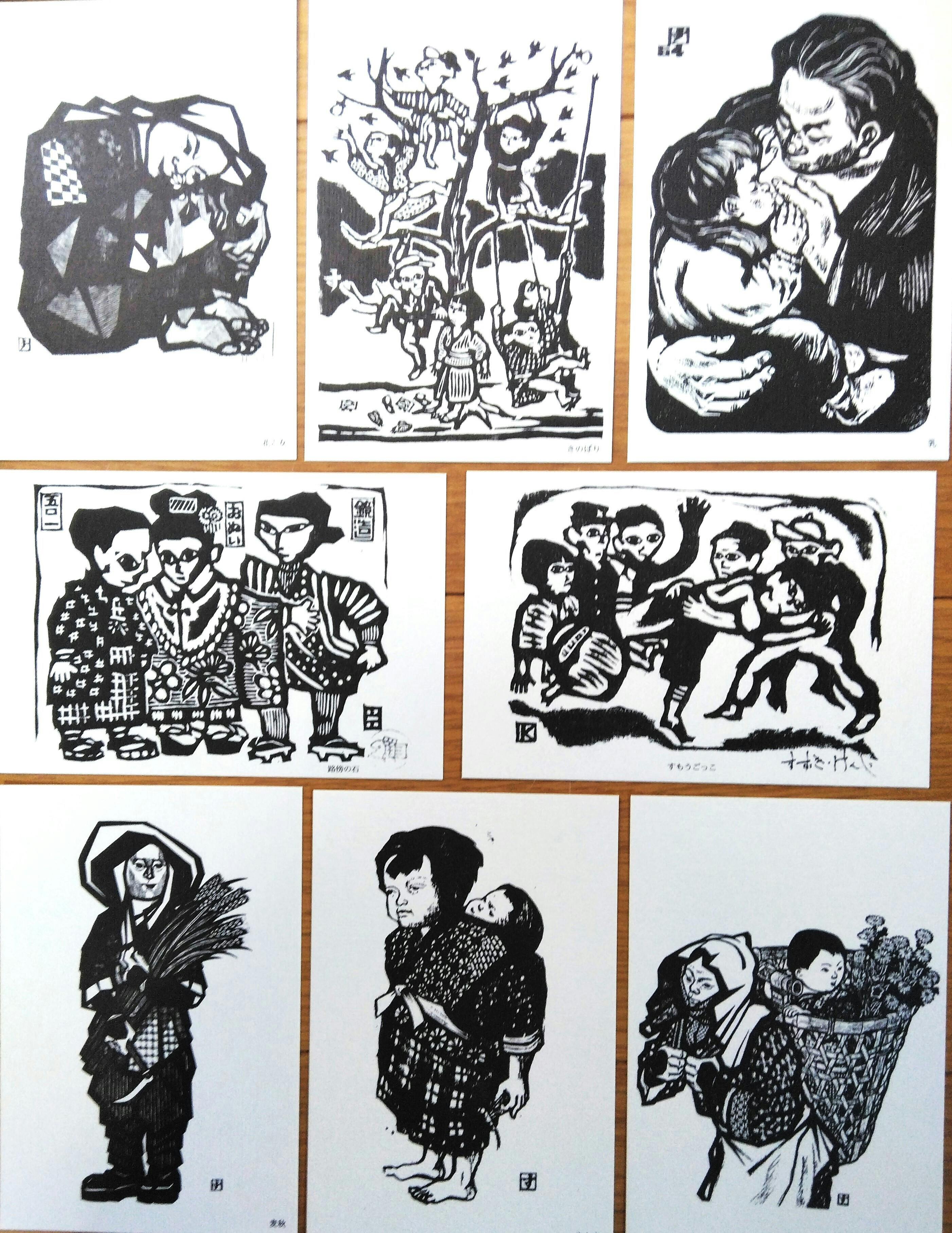 彫刻刀の先にはいつも女性、特に母親、そして子供,農夫、労働者がいました。戦前戦後の作品から8点を絵ハガキにしました。それぞれの作品に賢二らしいエピソードが隠されています。